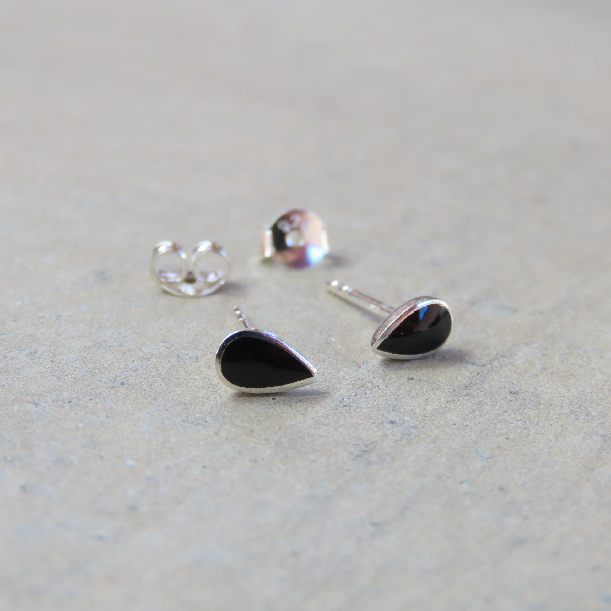 Delicate little teardrop shaped sterling silver earrings with a tiny piece of onyx in the center. Fair trade.