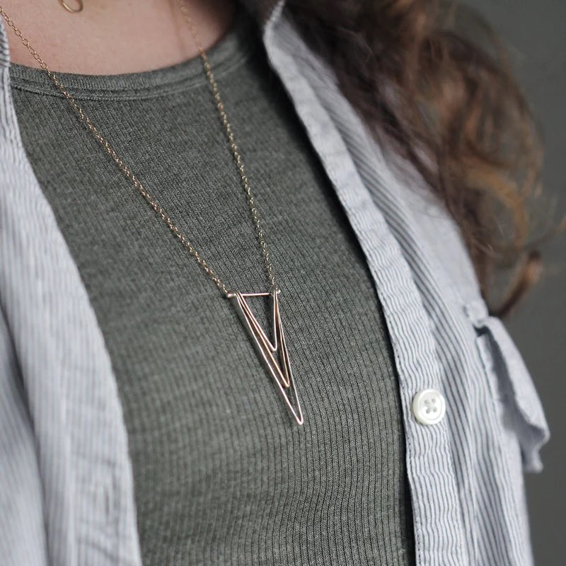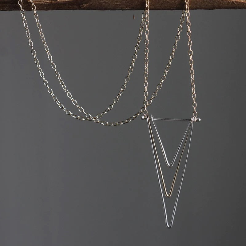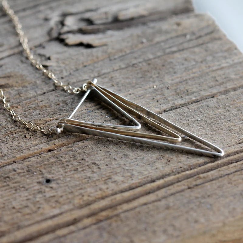 This necklace is made from three segments of heavy solid sterling silver or gold fill wire, and is hammered and bent to create this simple yet striking organic shape. Each piece is then drilled with two holes, which is fitted through with sterling silver wire which gets melted into little ball points to secure the delicate chain. Unlike many necklaces with a similar style, the design of this necklace was created to ensure that you never have to worry about the clasp sliding around to the front. This necklace is beautiful on its own or layered with other pieces.
