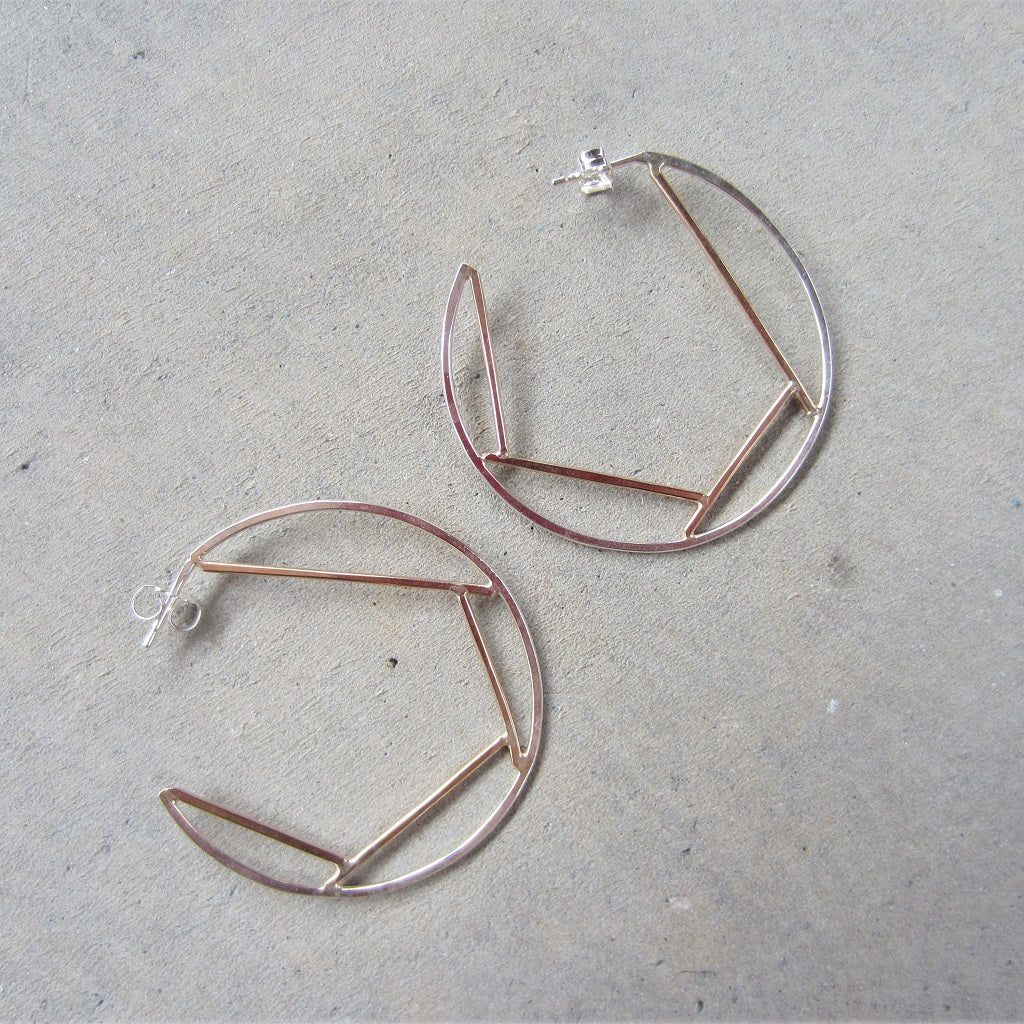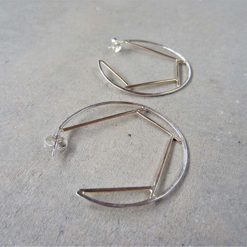 These eye-catching geometric statement earrings have an open circle hoop shape with fine straight segments bisecting the negative space, creating an angular interior border. They are bold and striking, yet incredibly light weight. So you can happily wear them all day and then straight on into your evening plans.