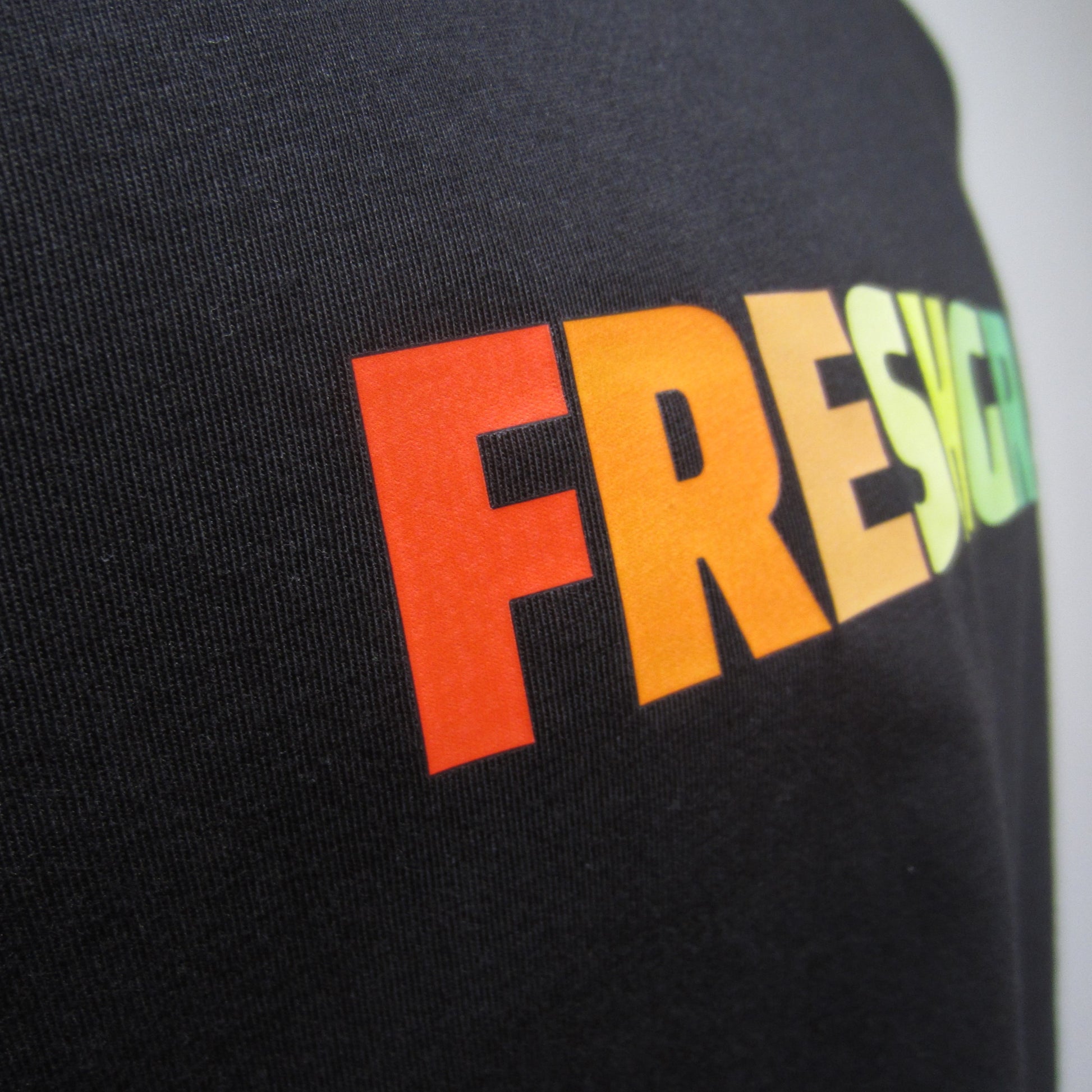 This substantial yet extraordinarily soft and comfortable FreshGrass t-shirt was made from 100% organic cotton fiber. Digitally printed on the front with a vibrant spectrum of colorful letters. Printed locally. A portion of proceeds support environmental initiatives.