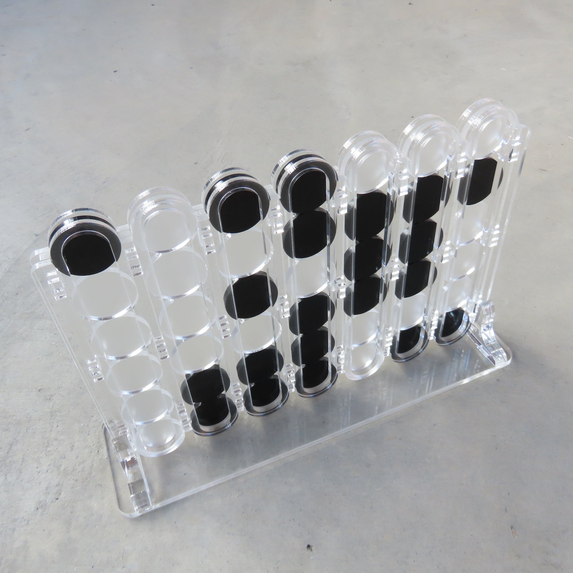 A unique and stylish re-imagining of a classic game. Games you love shouldn’t be an eyesore that you hide away when not in play. This clear acrylic game with black and frosted game pieces is designed to not only enhance your game play, but also complement your home décor.
