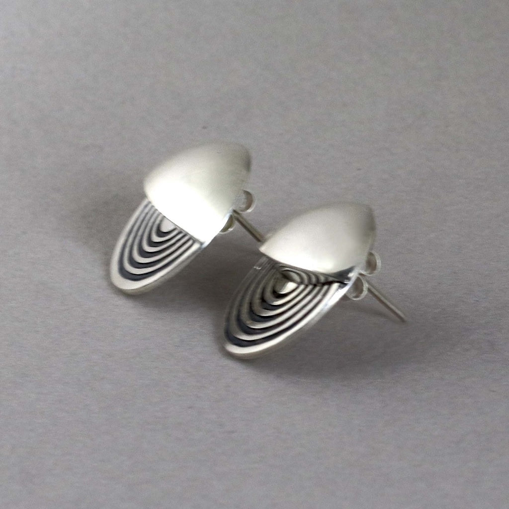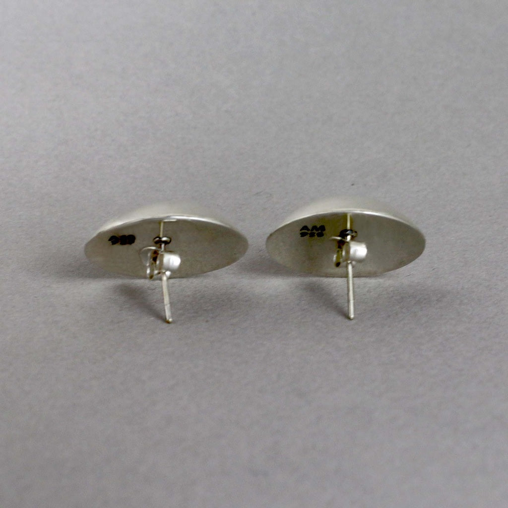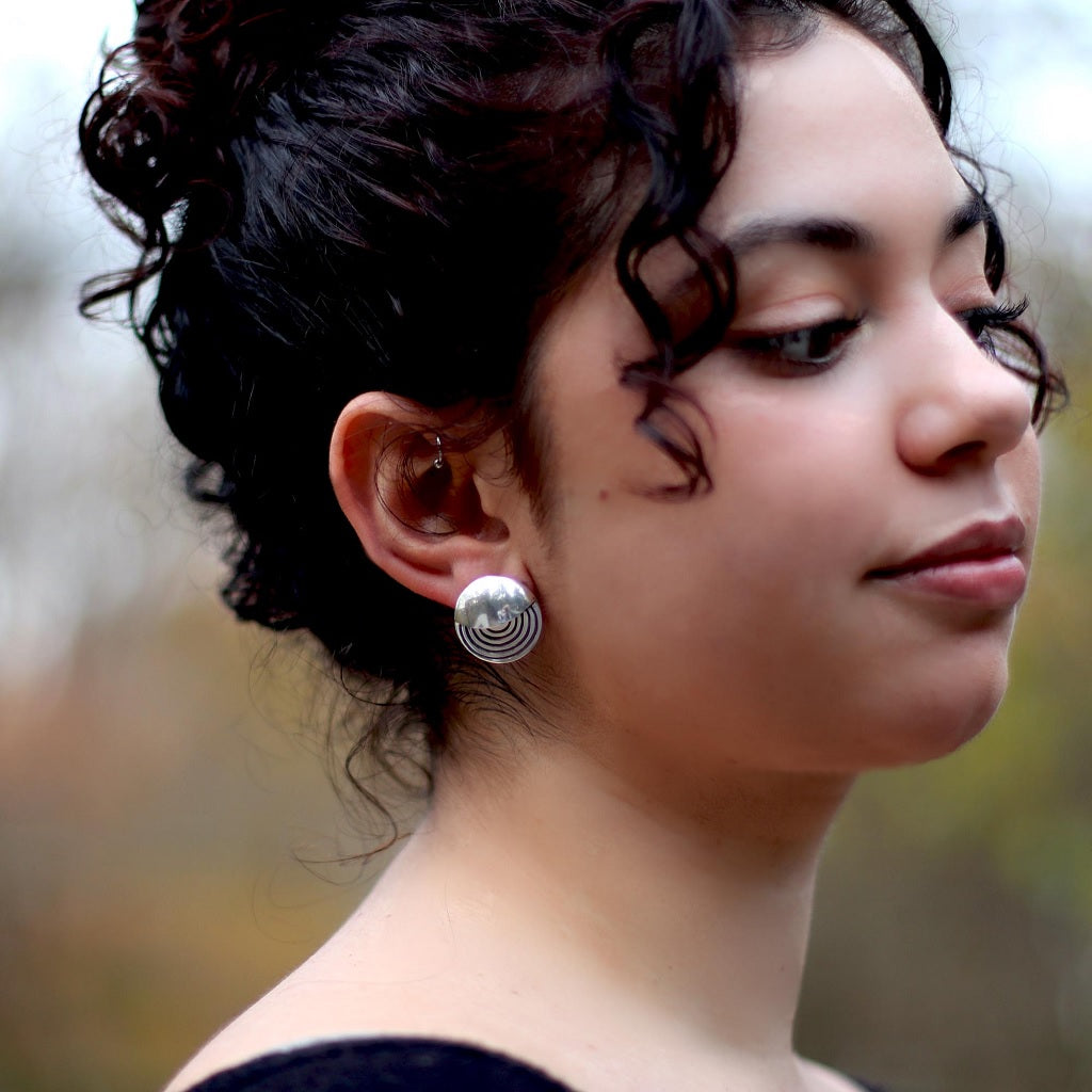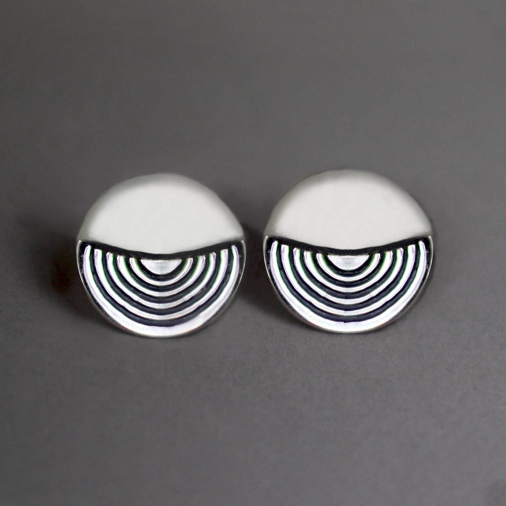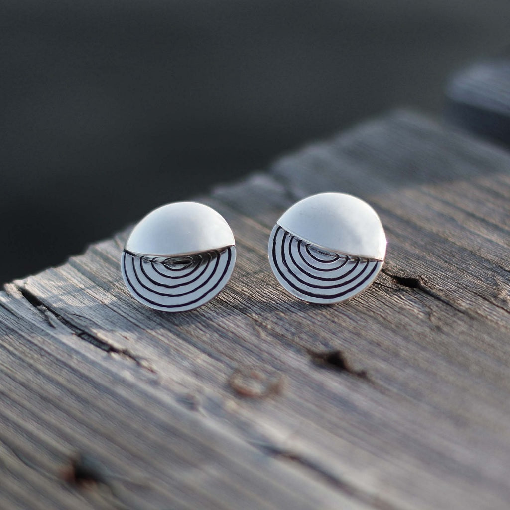 Made from .925 recycled sterling silver with oxidized etching, by Anni Maliki in Great Barrington, MA. Called the Halycon Posts for their calm, peaceful energy. They are reminiscent of glassy water before and after a pebble has disrupted its surface. Earrings measure approximately 0.9" diameter.