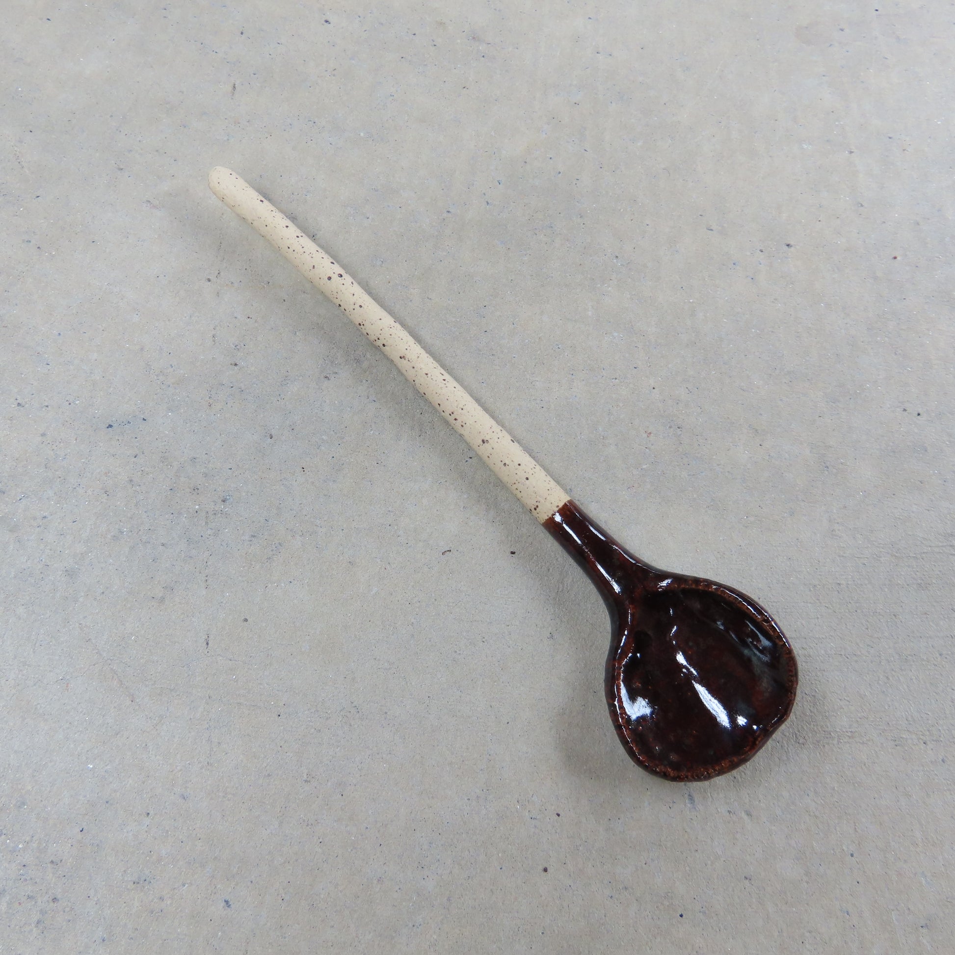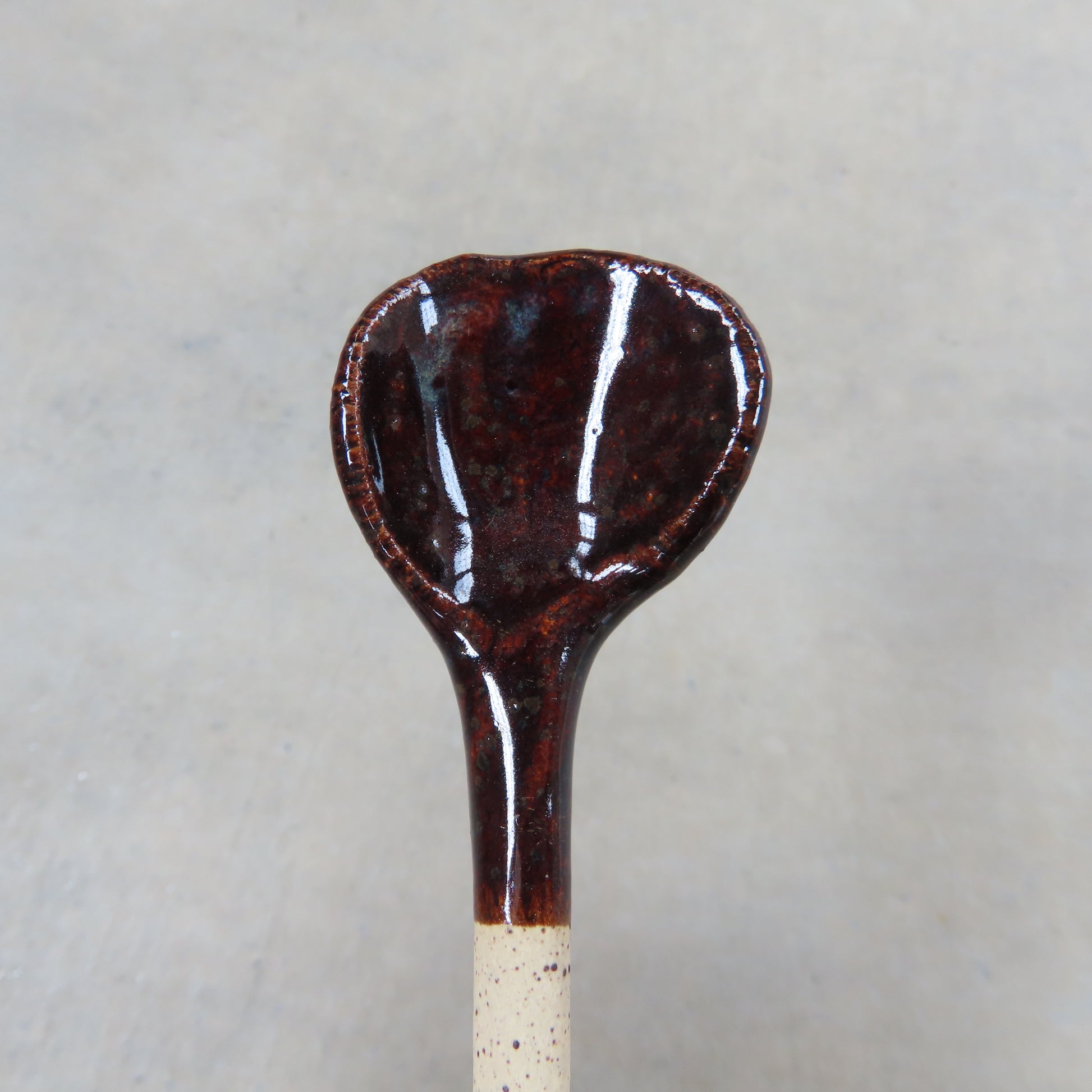 Featuring a beautifully colorful glaze on the head of the spoon, and a speckled, unglazed handle. As each piece is individually handcrafted, slight variations will occur.