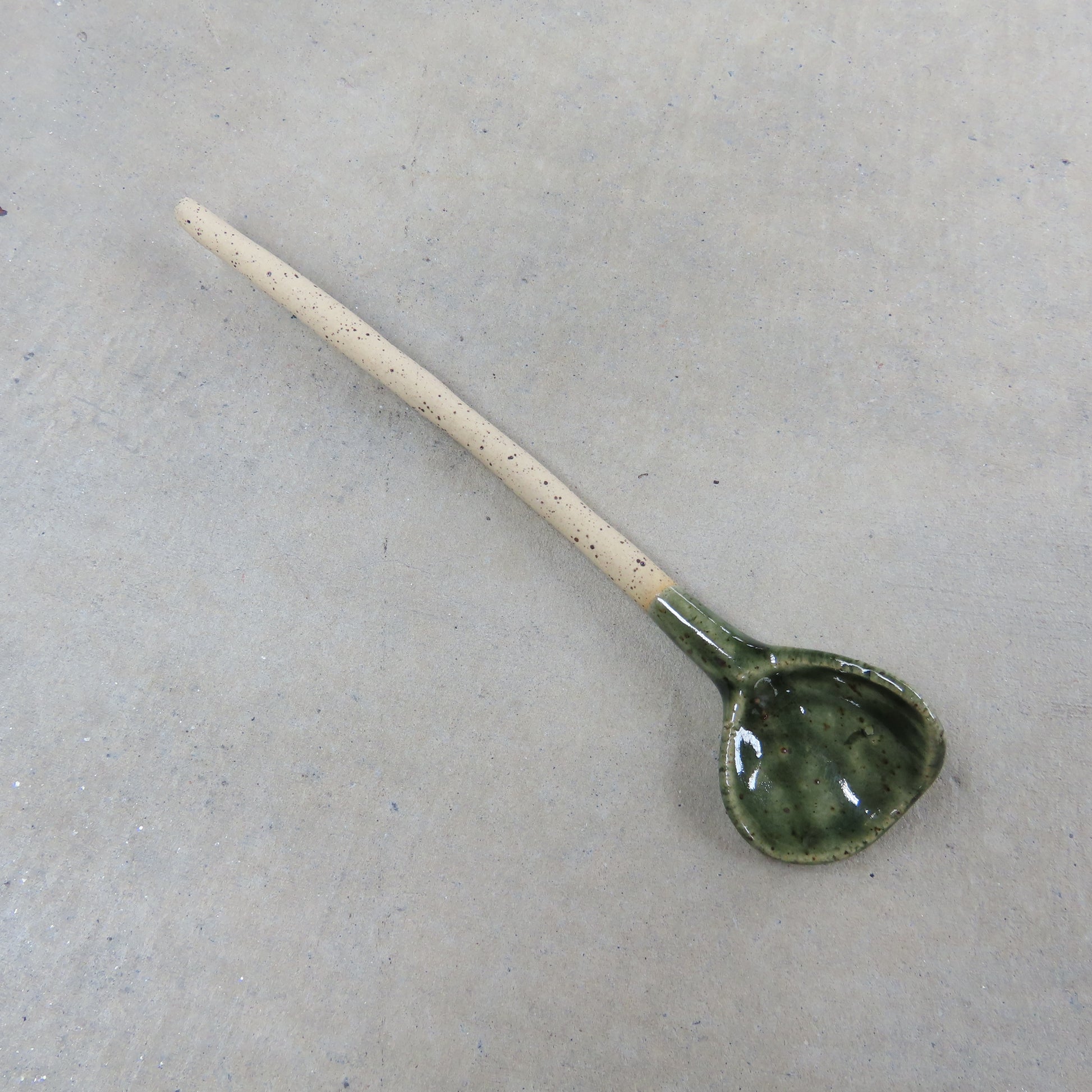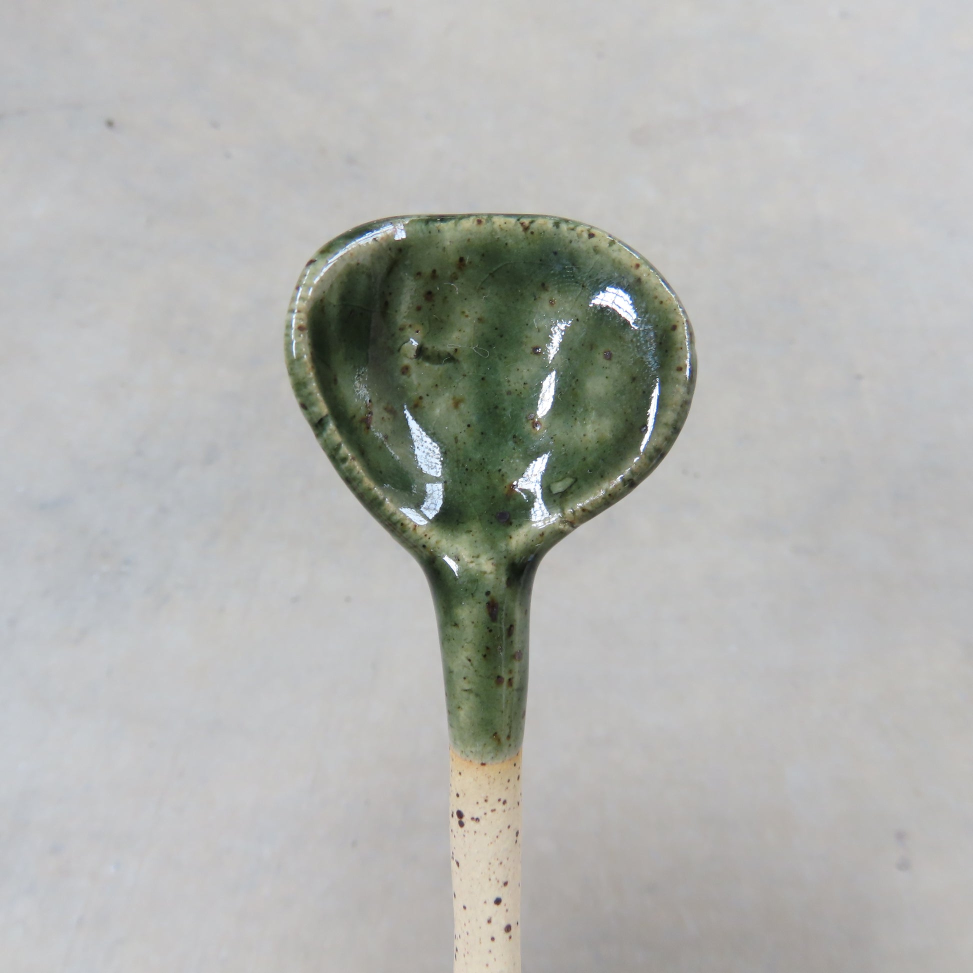 Featuring a beautifully colorful glaze on the head of the spoon, and a speckled, unglazed handle. As each piece is individually handcrafted, slight variations will occur.
