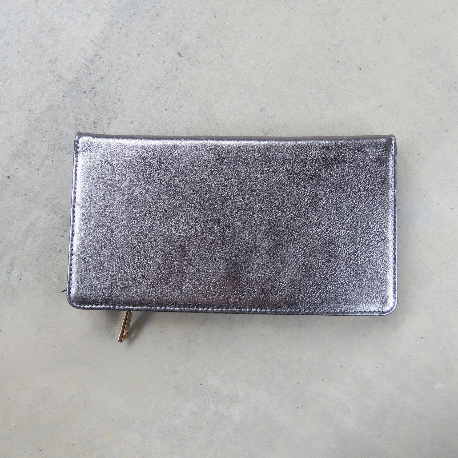 Handcrafted in genuine metallic leather, Jesse Clutch Wallet is the roomiest wallet size we carry, with; eight credit card slots, an ID window, billfold compartments on one side, two slip pockets on the other side valid for receipts, cash, or cell phone.