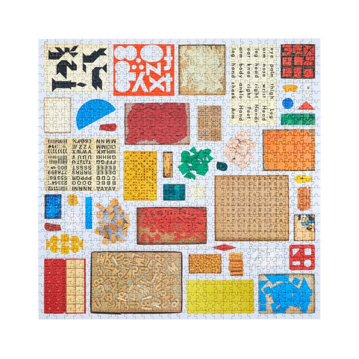 This 1000 piece, 25" square puzzle created by Micah, consists entirely of found objects culled from his archive of teaching tools, games, puzzles, tests, building blocks, stationery, stencils, magic tricks and any number of utilitarian objects.