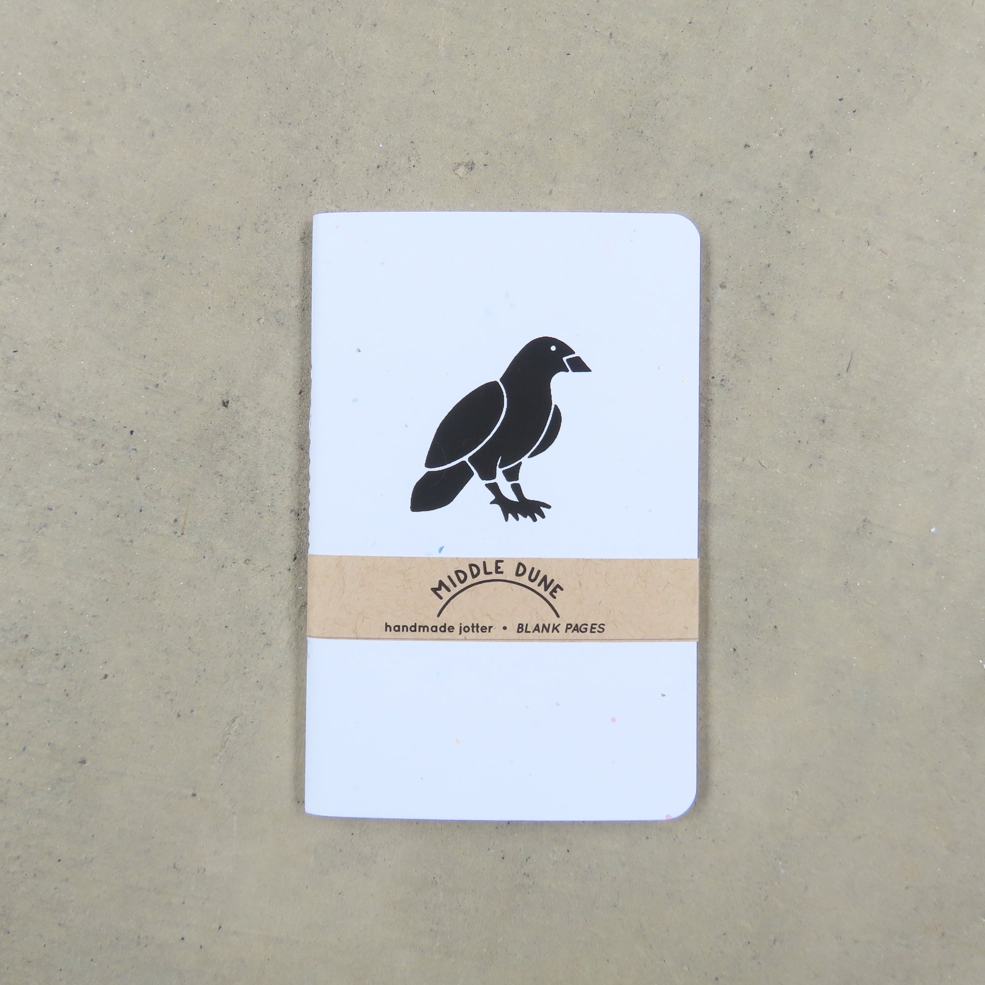 This slim handmade jotter features a sturdy, white card stock cover with a black screen printed crow.