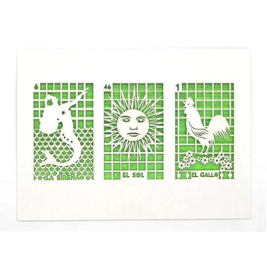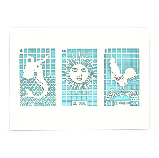 Laser Cut Greeting Card: 3 on 1 Loteria - La Sirena, El Sol, El Gallo