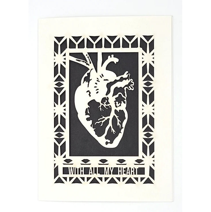 These intricate and beautiful laser cut greeting cards were made in Chula Vista, California by Two Hermanas. Cards are chlorine free and composed of 100% recycled material.