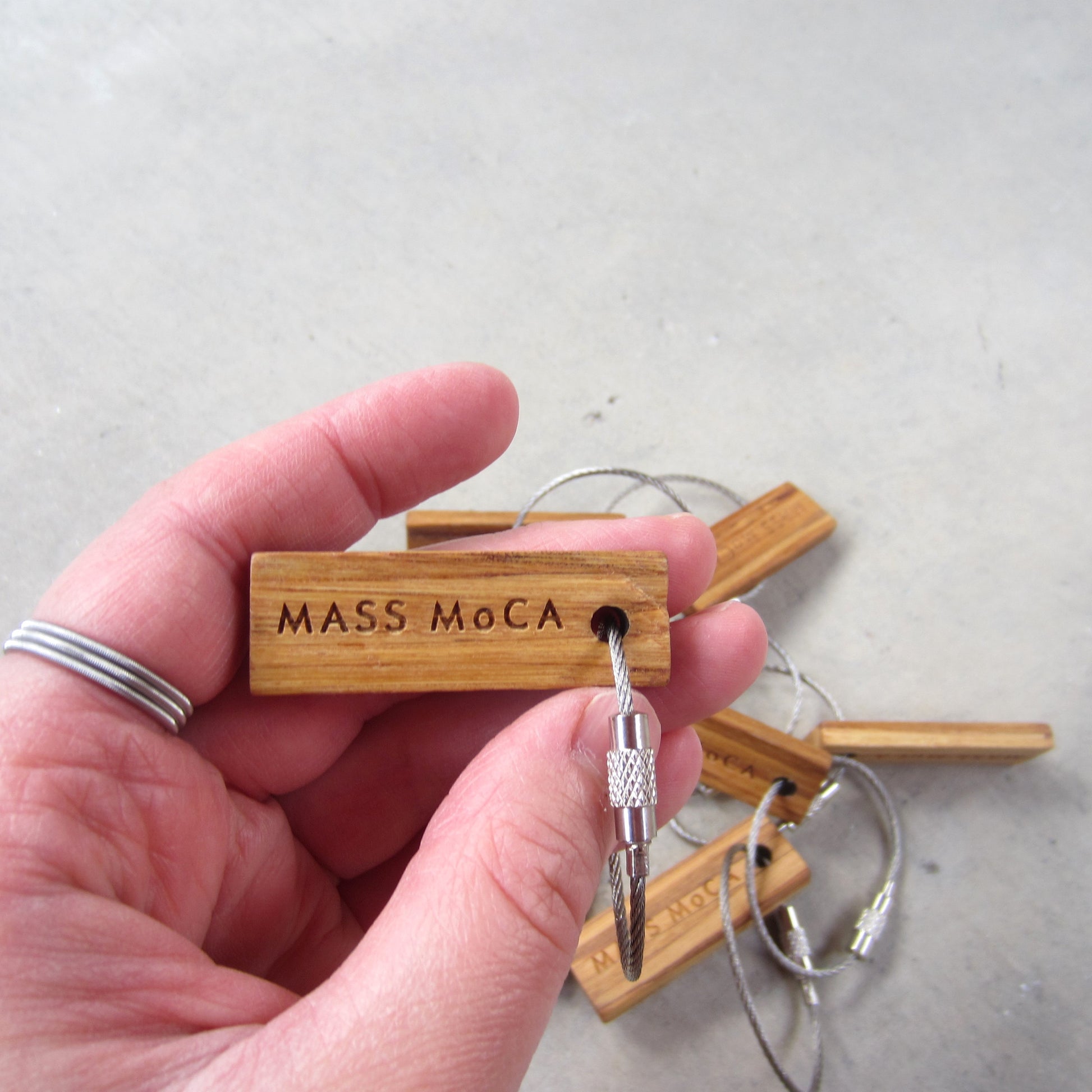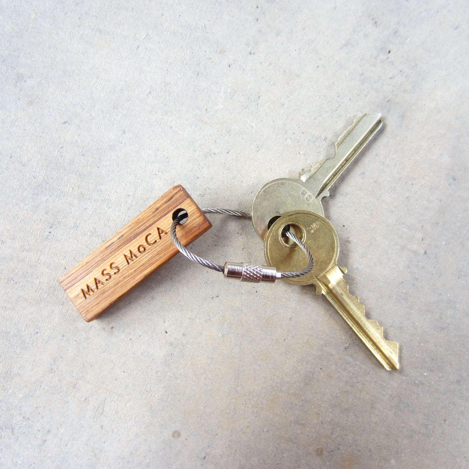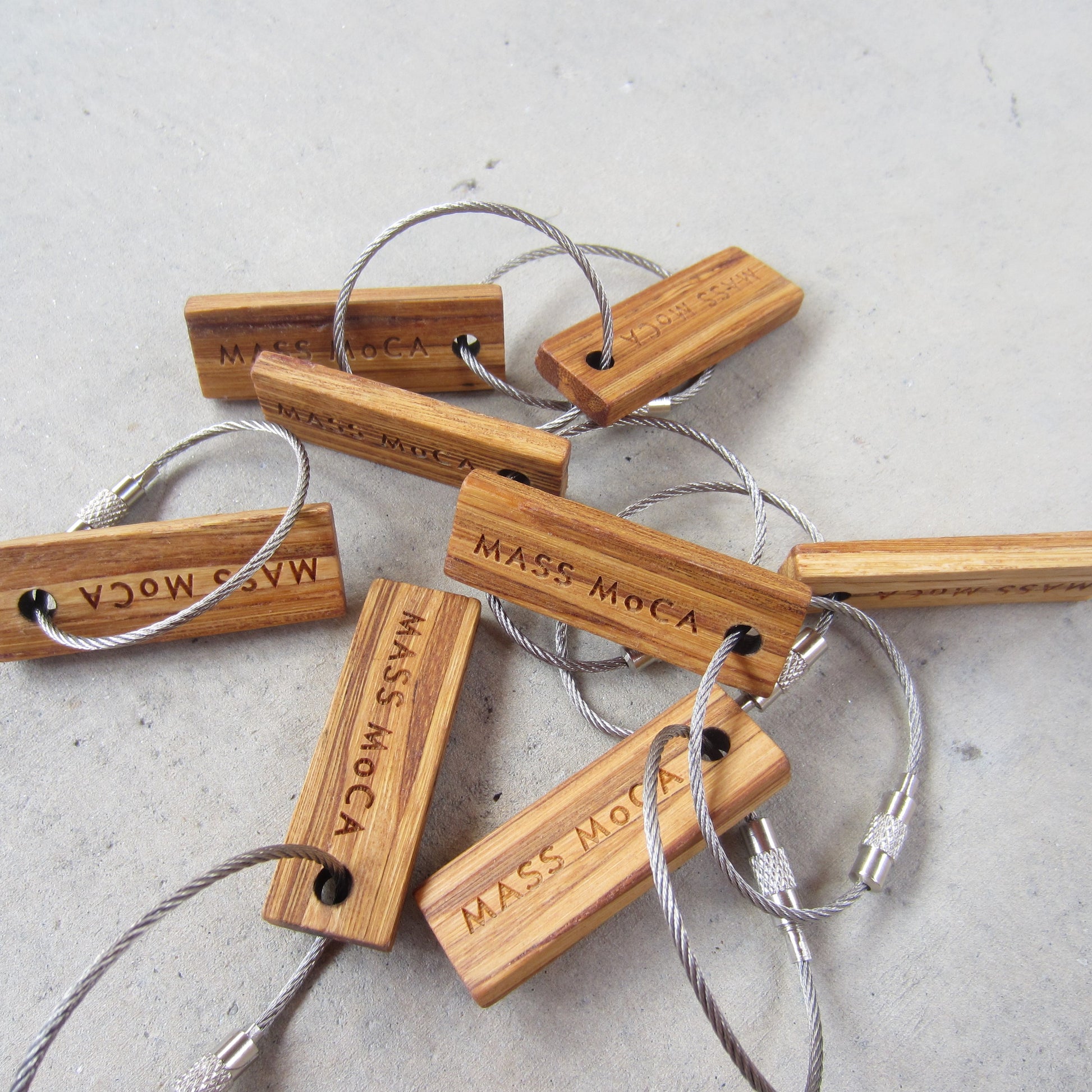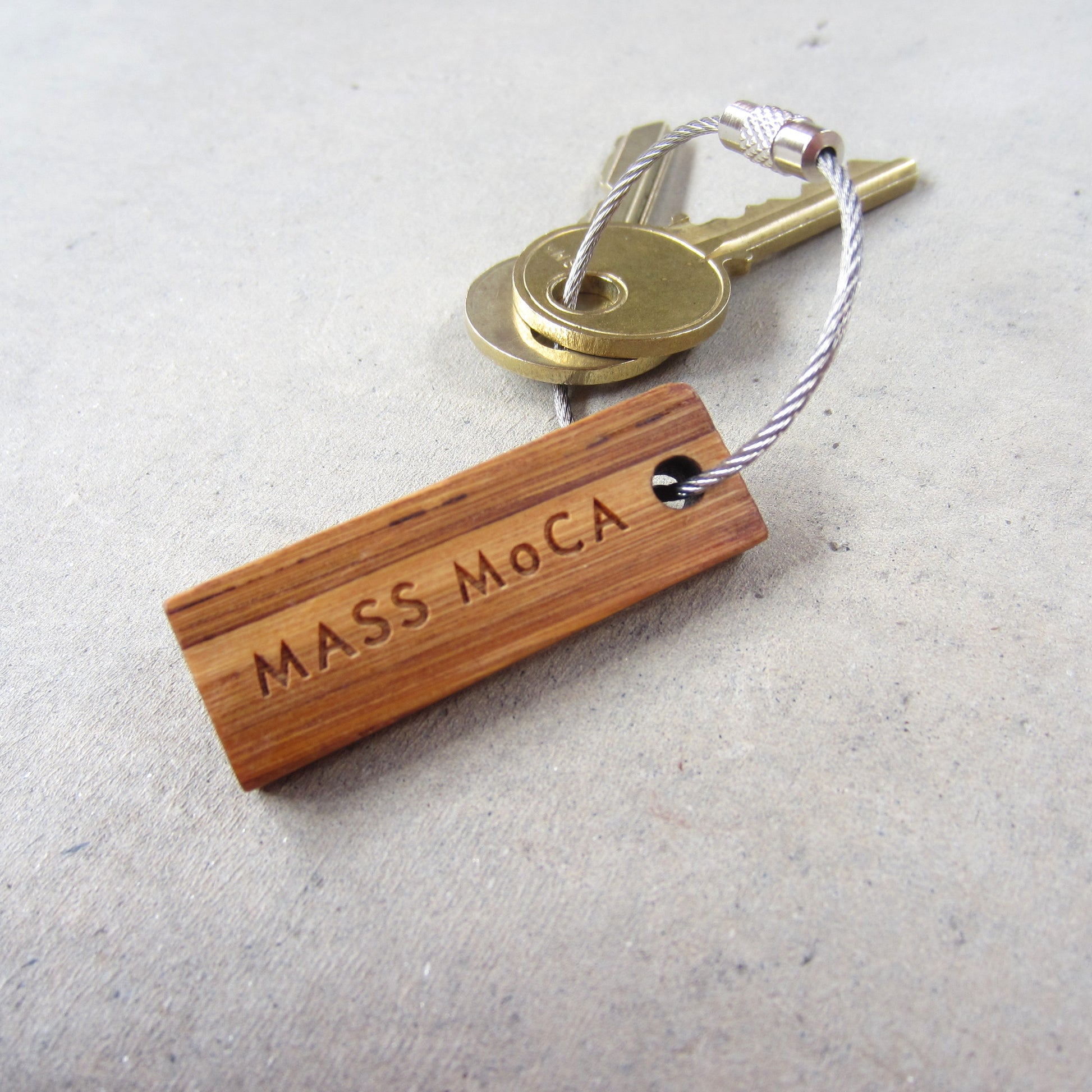 Made in Boston, Massachusetts, these keychains are made from 100% recycled chopsticks, sourced locally. Engraved on both sides with the MASS MoCA logo and featuring a generously sized ring made of aircraft cable rather than the typical split ring.