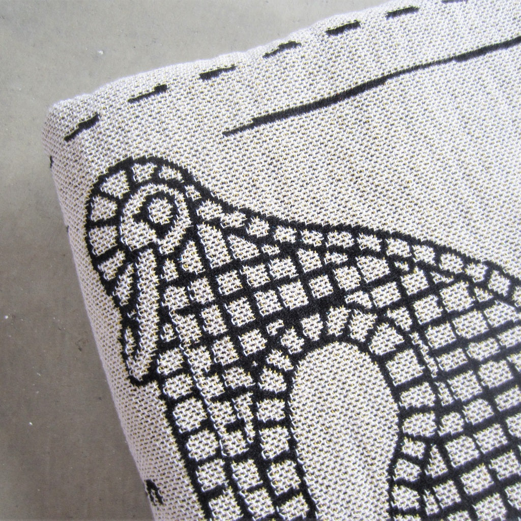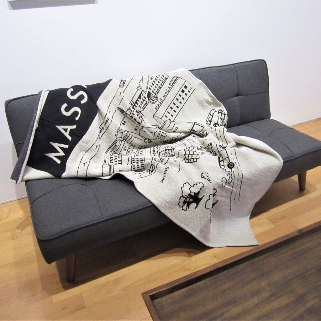 This cozy MASS MoCA throw blanket is woven from 95% cotton and 5% poly threads and it measures approximately 51" x 69". Designed in Brooklyn and made in the USA, the black and white design on it is a fun and whimsical illustration of the MASS MoCA complex.
