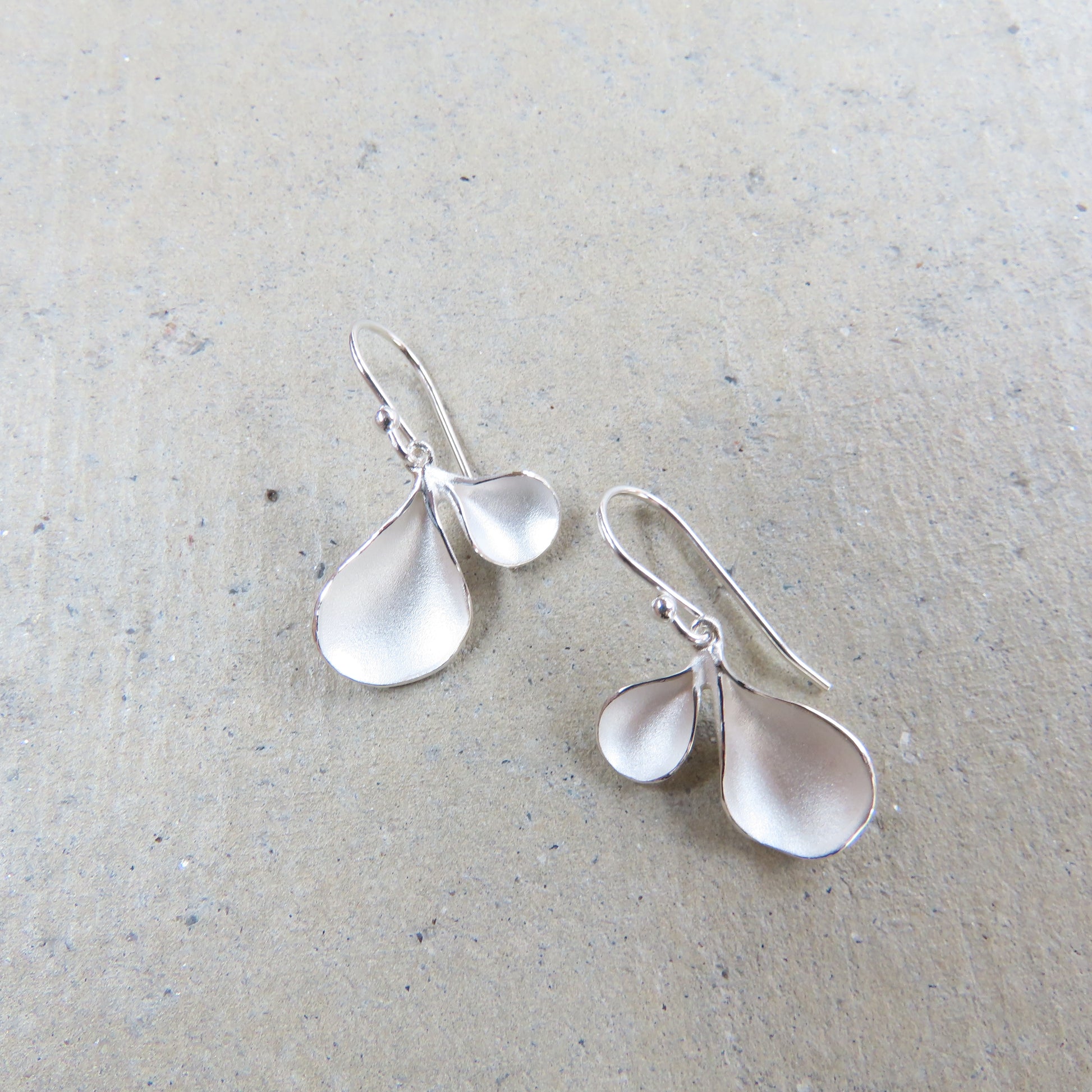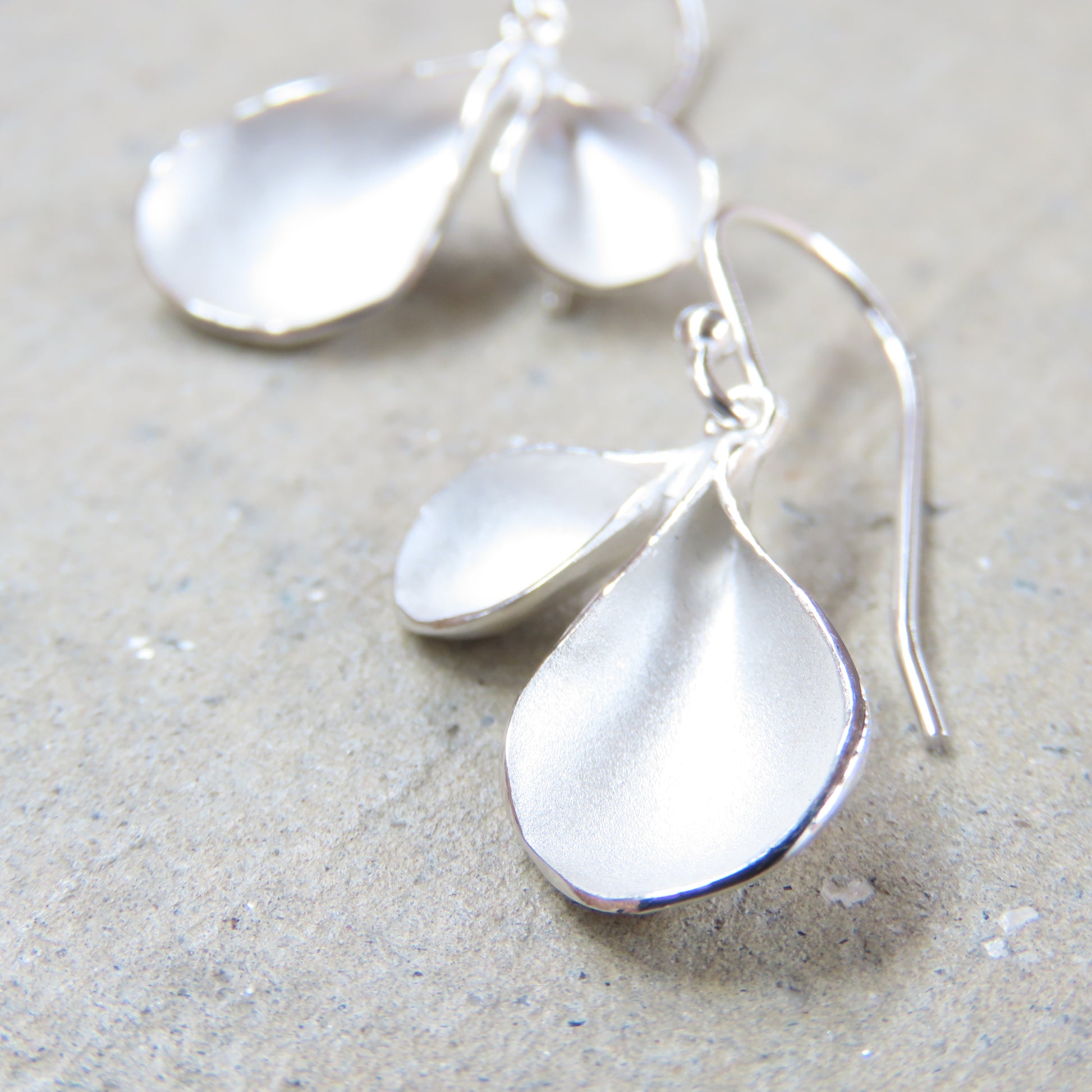 Two beautifully delicate and organic shaped silver petals dance from French ear wires. Measuring approximately 2/5" x 1 1/8" x 1/8"