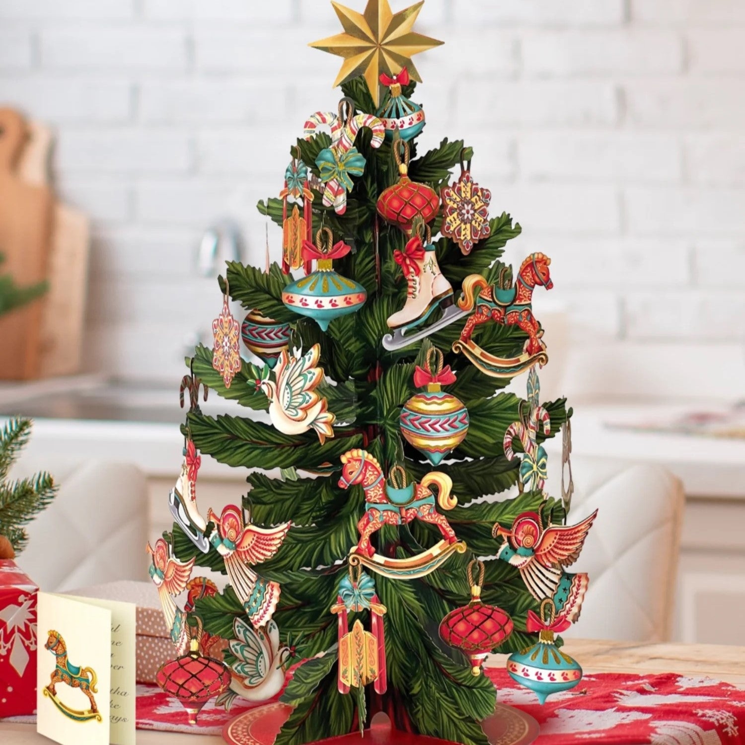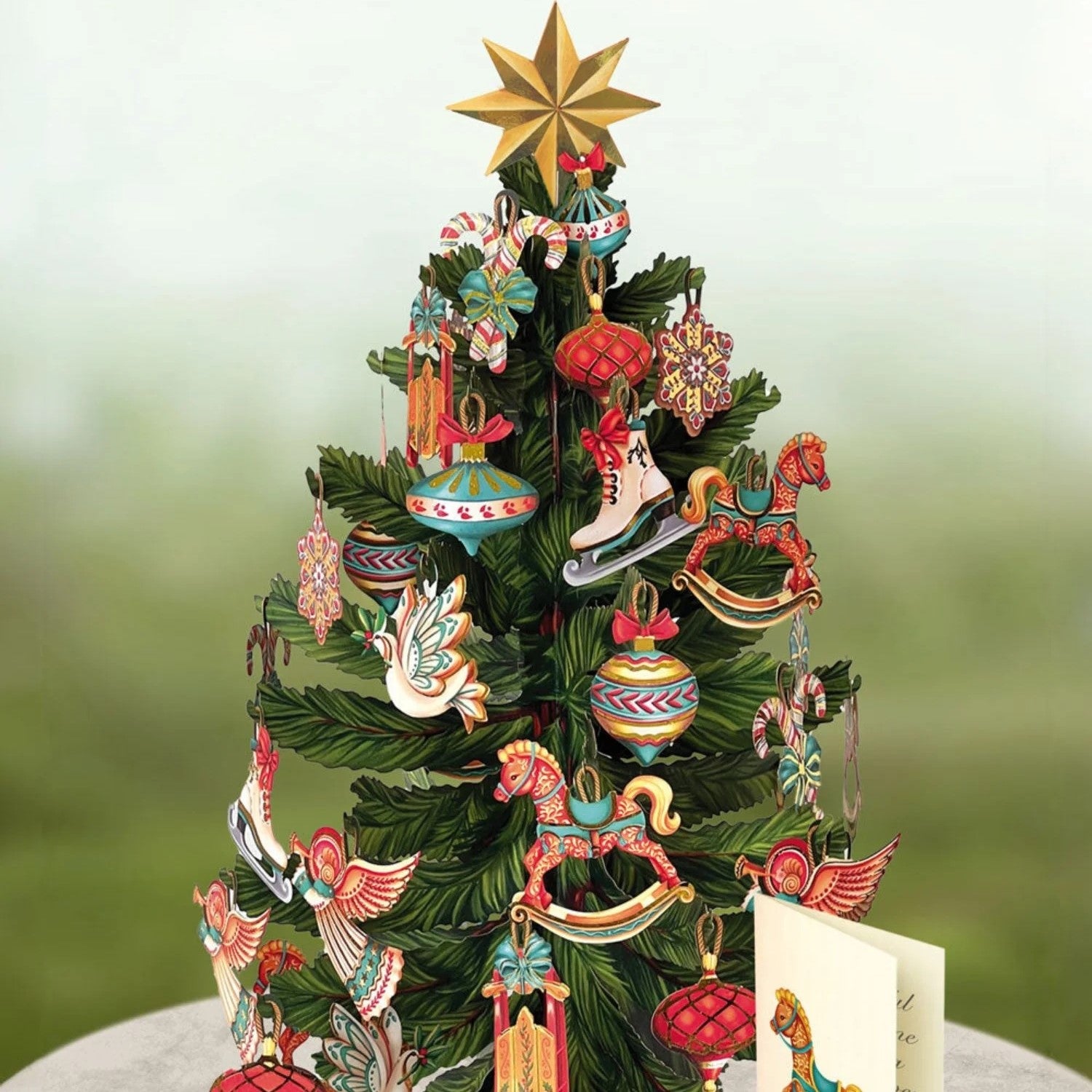 This gorgeous pop up paper tree includes over 80 colorful assorted ornaments, a matching note card, and a festive mailing envelope. Measures approximately 16" high by 10" across. For every paper tree sold, a tree is planted in your honor. Paper tree and envelope are 100% recyclable paper.