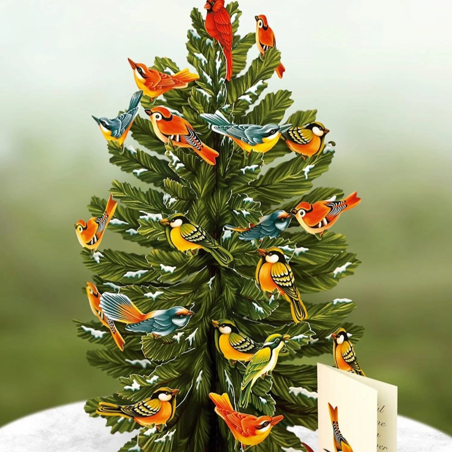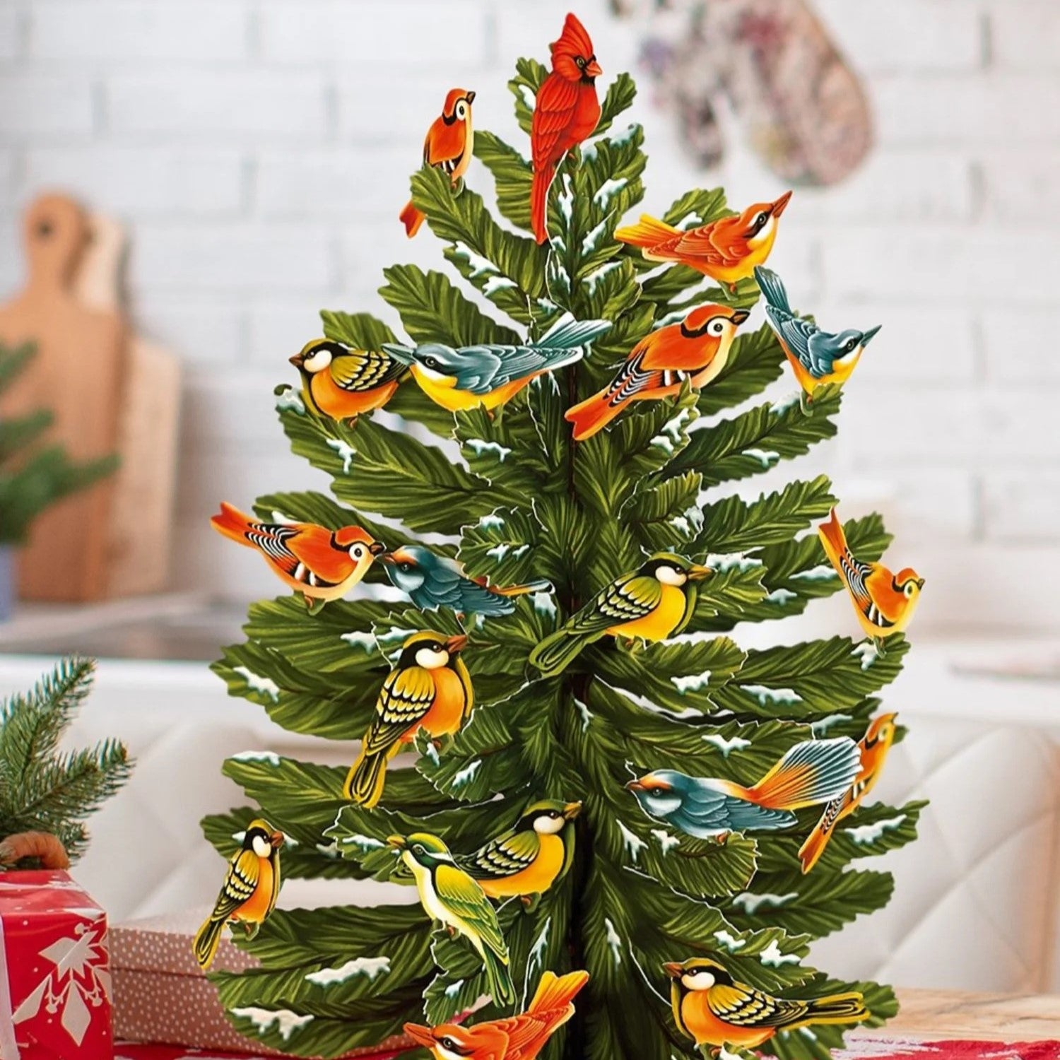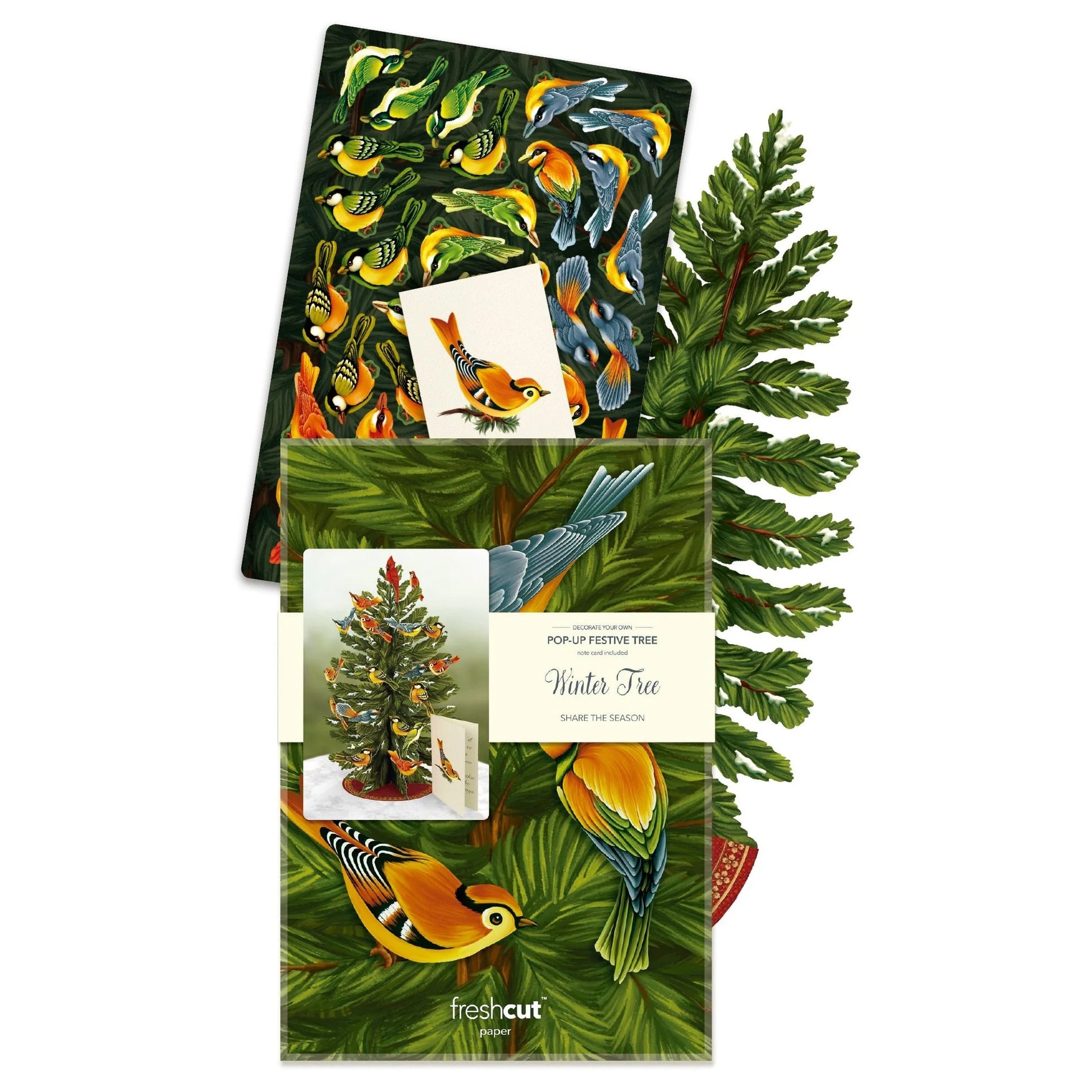 Celebrate the season with FreshCut Paper's snow-tipped balsam fir. With 36 colorful assorted birds included, you can bring the the delightful landscapes of winter into your home. This pop-up tree is a great activity and tradition for your family. Create your unique tree or add birds each day of the season! The birds are very easy to attach as they all have their own slot to perch right on the tree.