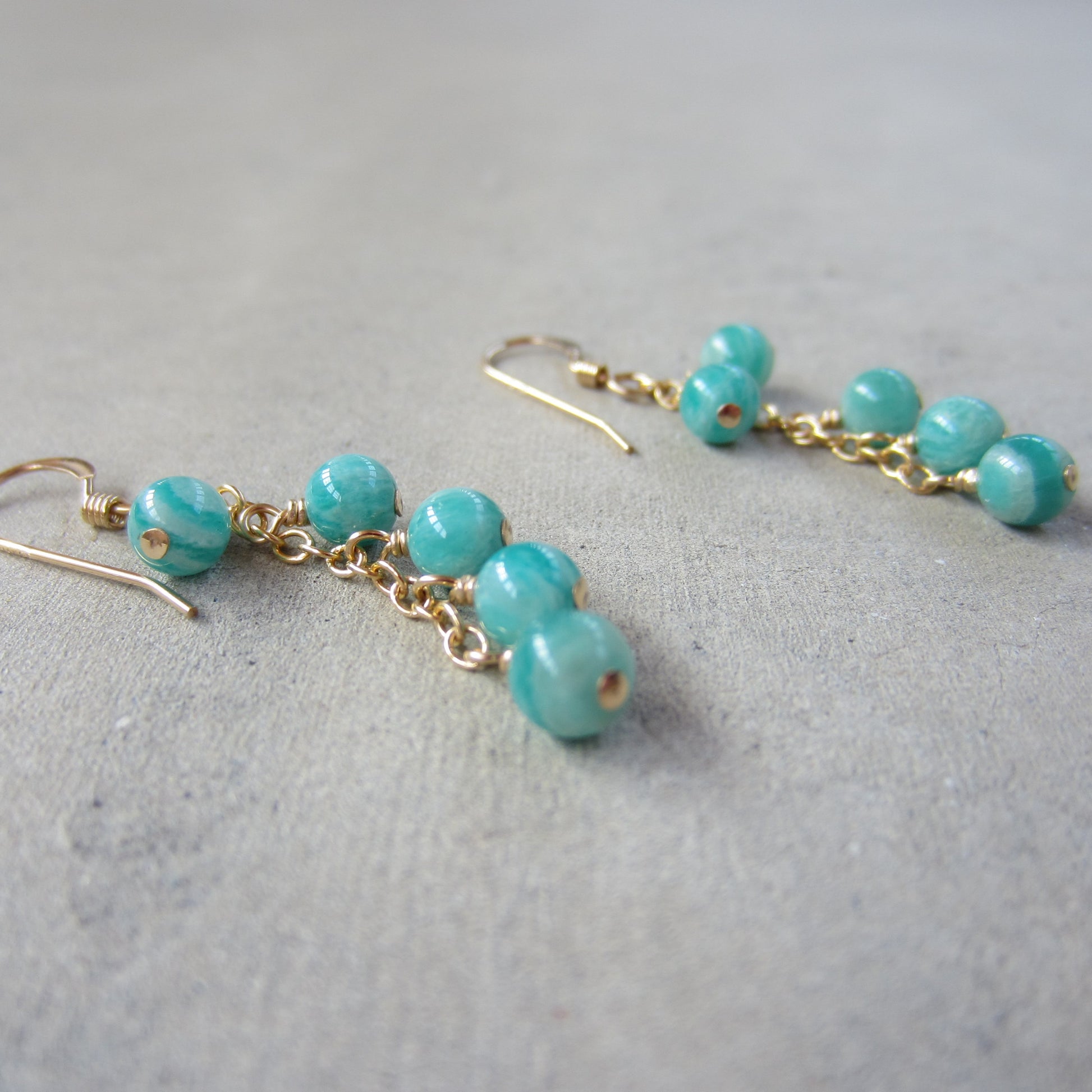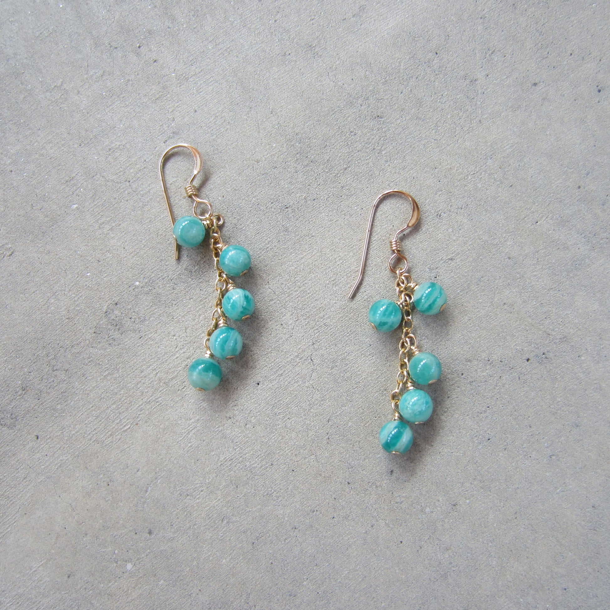 These beautiful Amazonite cluster earrings dangle from14k gold fill French hook ear wires. A stone of connecting with intuition and dissipating negative energy, Amazonite is extremely soothing while calming the mind and balancing emotions.