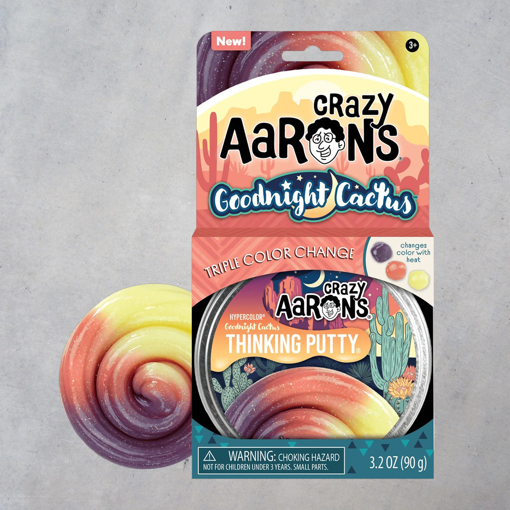 Mimicking a magnificent desert sunset, Goodnight Cactus Thinking Putty® changes color with the heat of your hands. This triple change Hypercolor® captures the peaceful purple, luminous orange, and radiant yellow sundown of the night sky.
