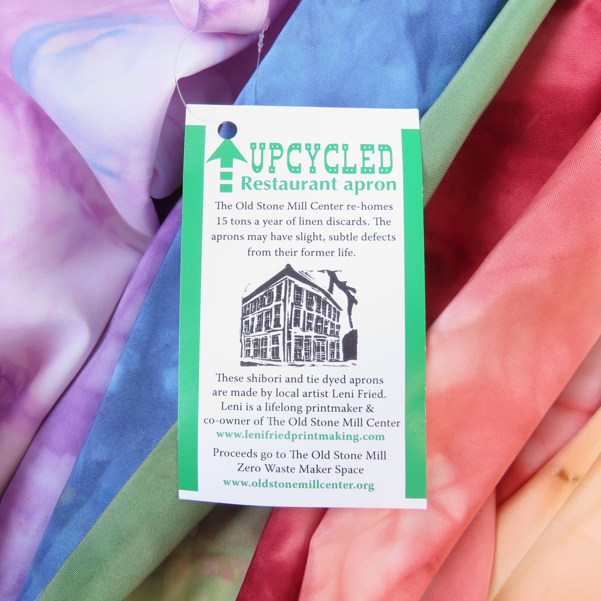 This former restaurant kitchen apron was rescued from a local industrial laundry facility. Tie dyed by hand by local artist Leni Fried, each apron is totally one of a kind. Proceeds benefit The Old Stone Mill Center in Adams, Massachusetts, which is a zero waste maker space.