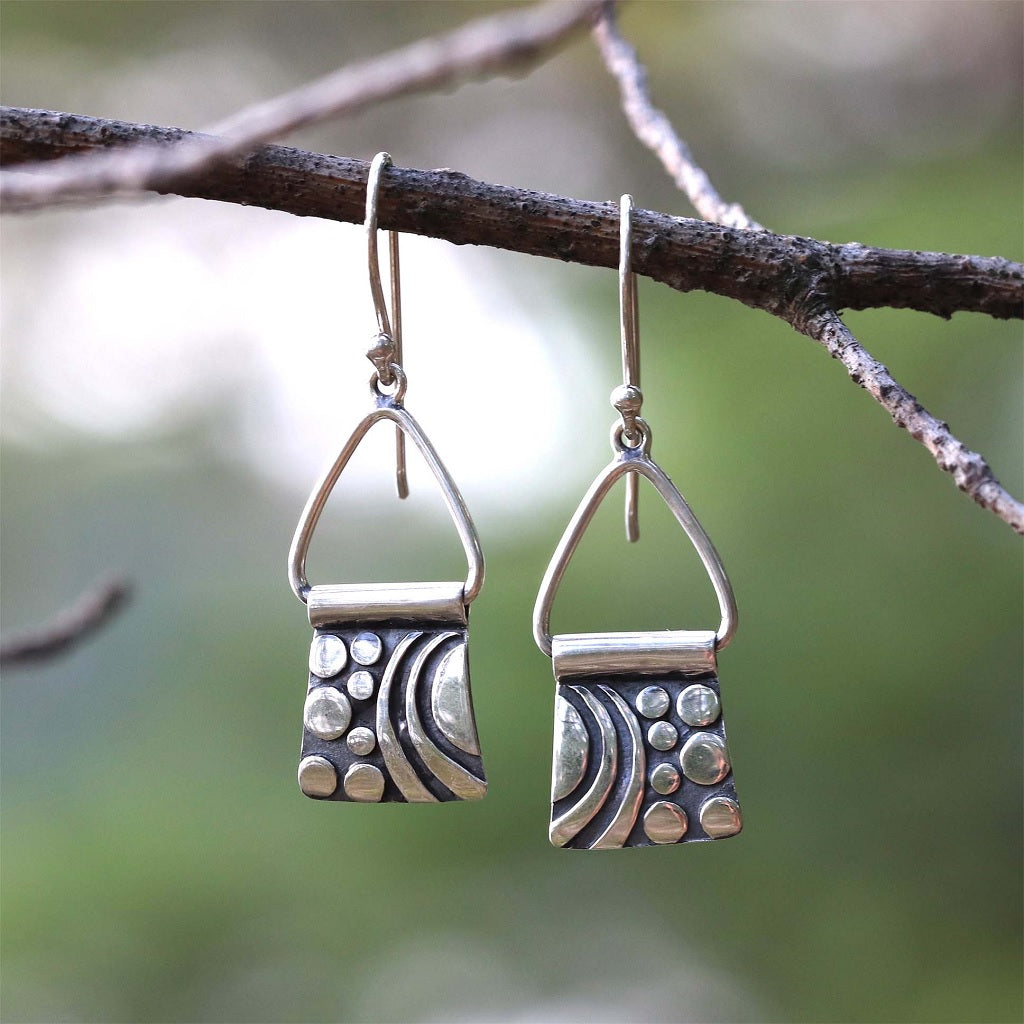 Named for their watery, dancing energy, the lower part of these earrings swings lightly from the upper triangle. Meanwhile, bright little circles - offset by oxidation - dance like dappled moonlight on water. Made from .925 recycled sterling silver, by Anni Maliki in Great Barrington, MA.