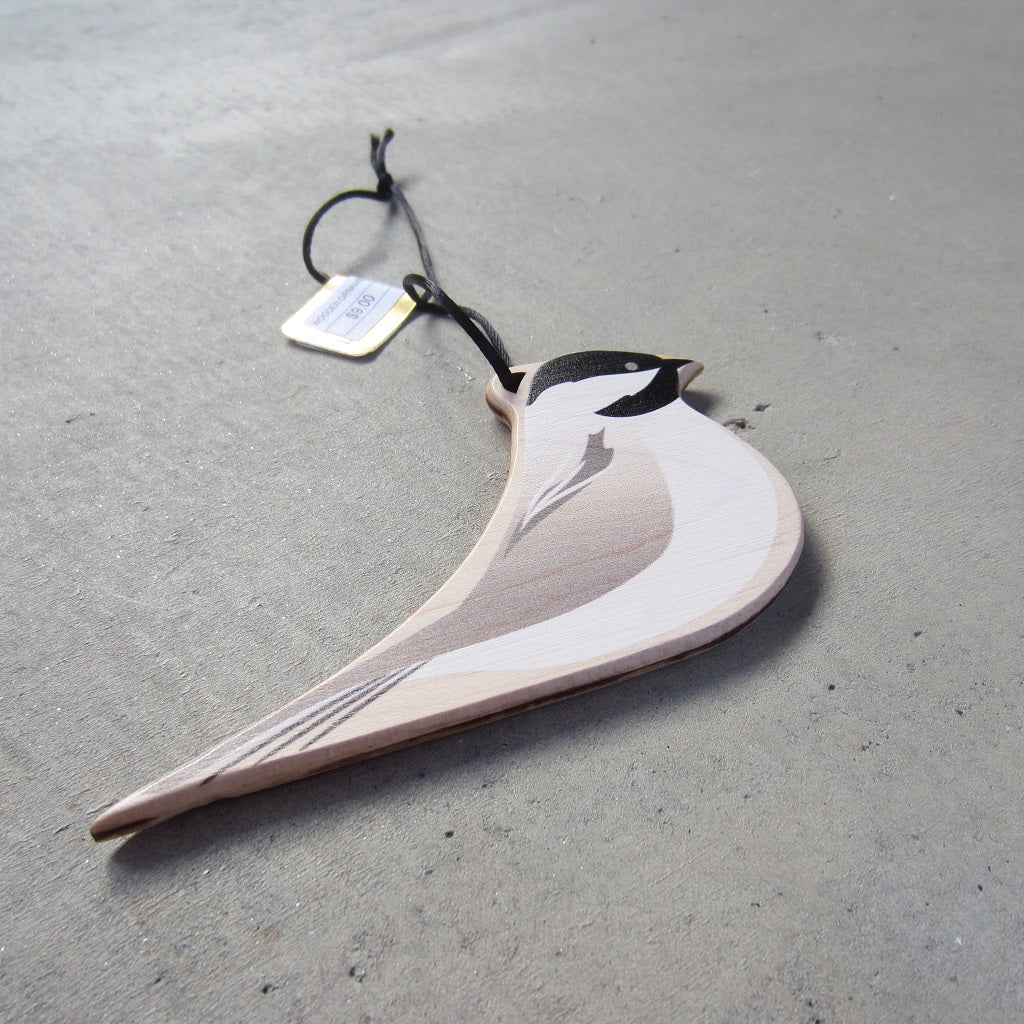 A perfect gift for the bird lover in your life. Printed on both sides. Measures approx. 4.25" long by 3" tall by 0.2" thick. The wooden ornament is tied with a black cord (approx. 6") and a gold foil tag. Made in Middlebury, Vermont.