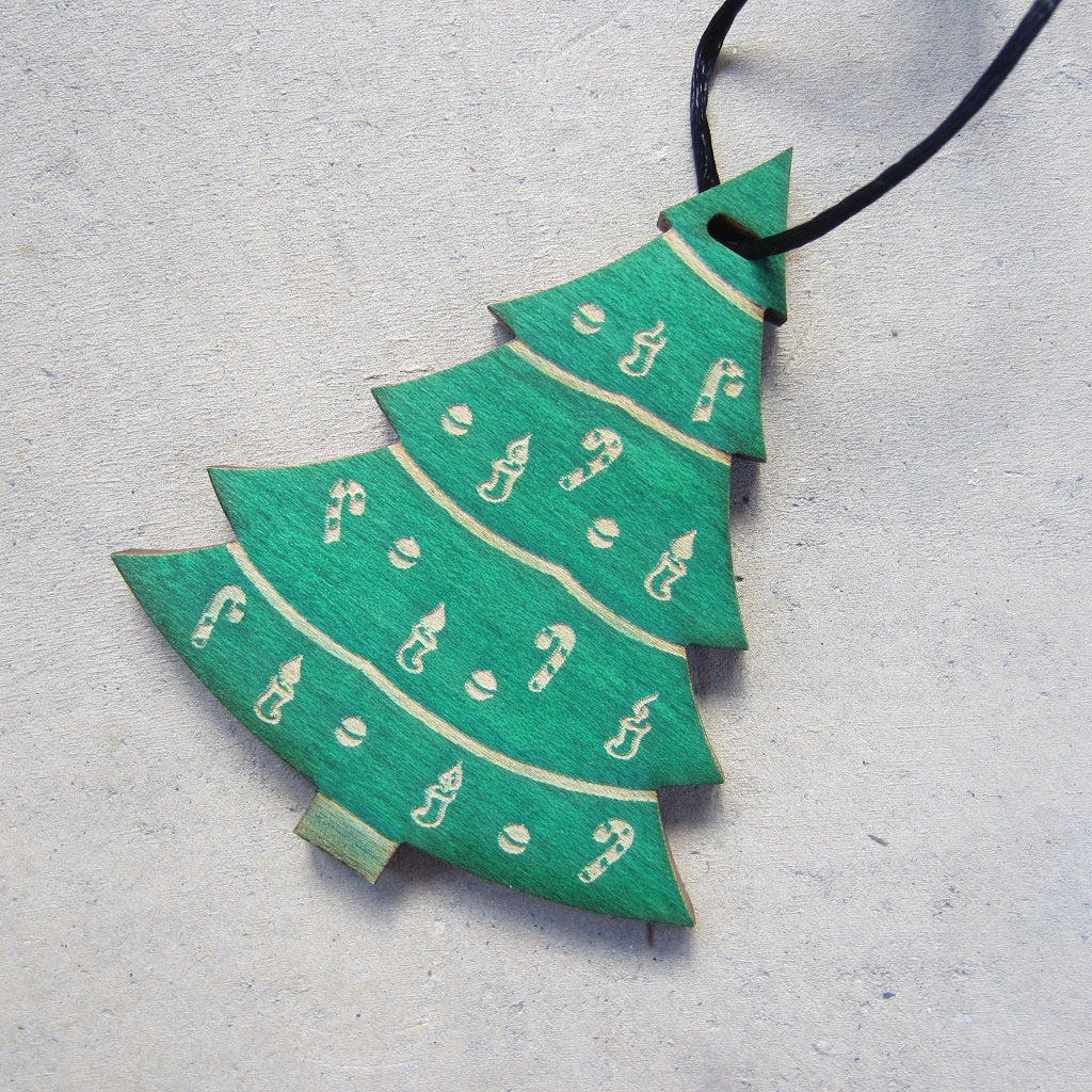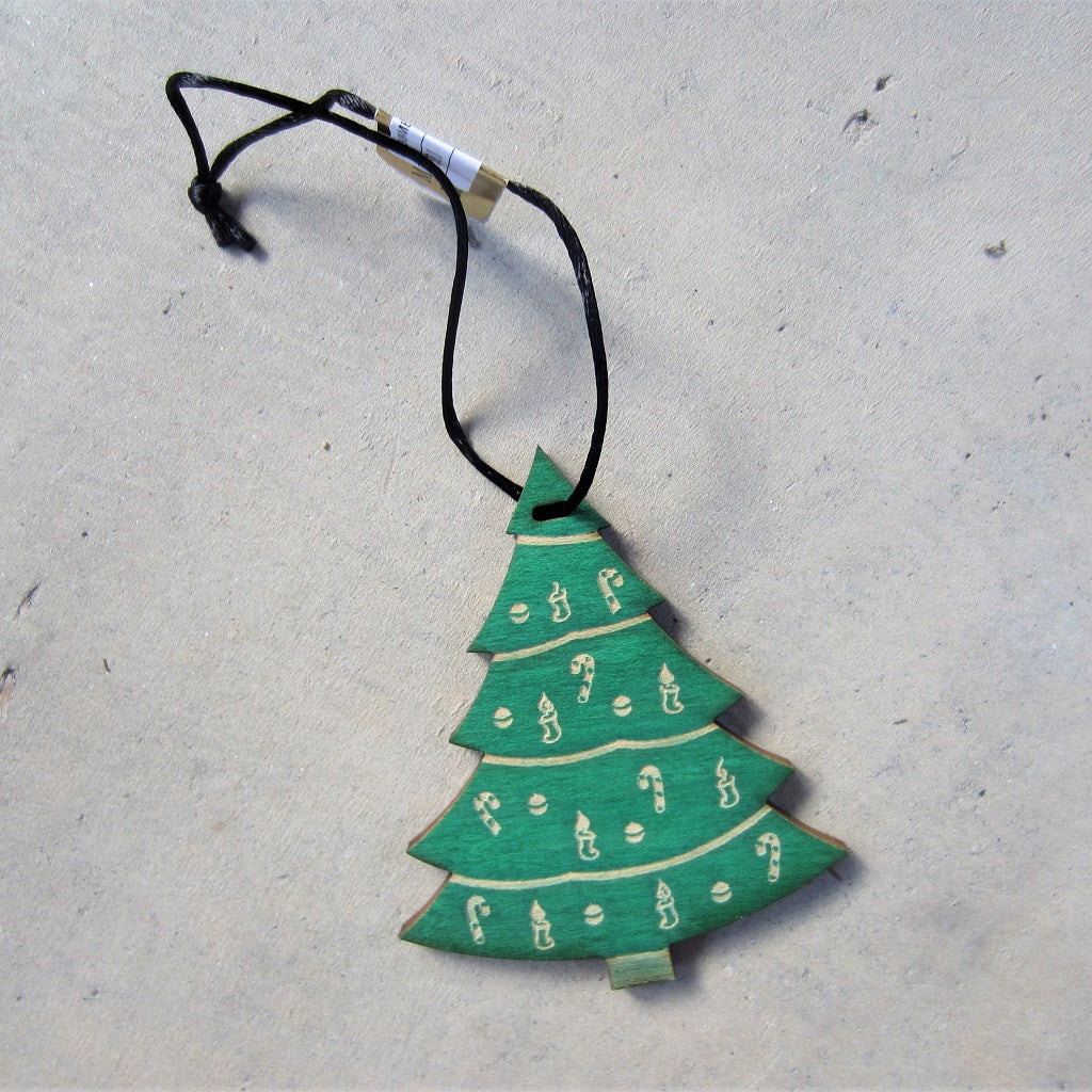Hang a tree on your tree! This Christmas Tree Colored Ornament is crafted from locally sourced, sustainably harvested maple hardwood, and measures approximately 2.8" wide by 3.4" high by 0.2" thick. The wooden ornament has a green finish and is tied with a black cord. Made in Middlebury, VT.