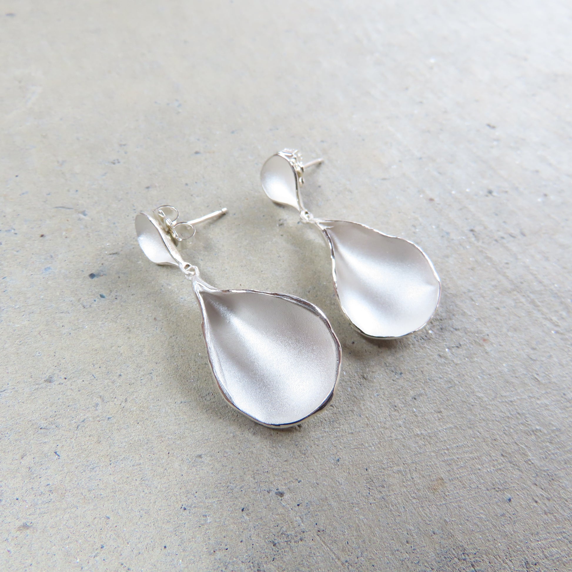 These exquisite and striking organic shaped stud earrings are made from sterling silver. An extra large petal shape dangles from a very small petal shape. Measurements are approximately 1 1/2" x 5/8" x 1/4"